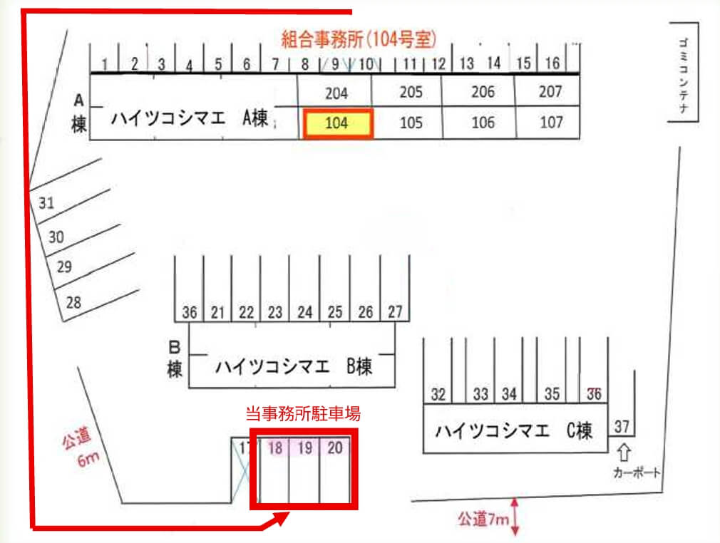 来客用駐車場は、高架下の交差点を左折してすぐ、事務所の裏手側にあるハイツコシマエC棟付近、No18,19,20 の3台です。